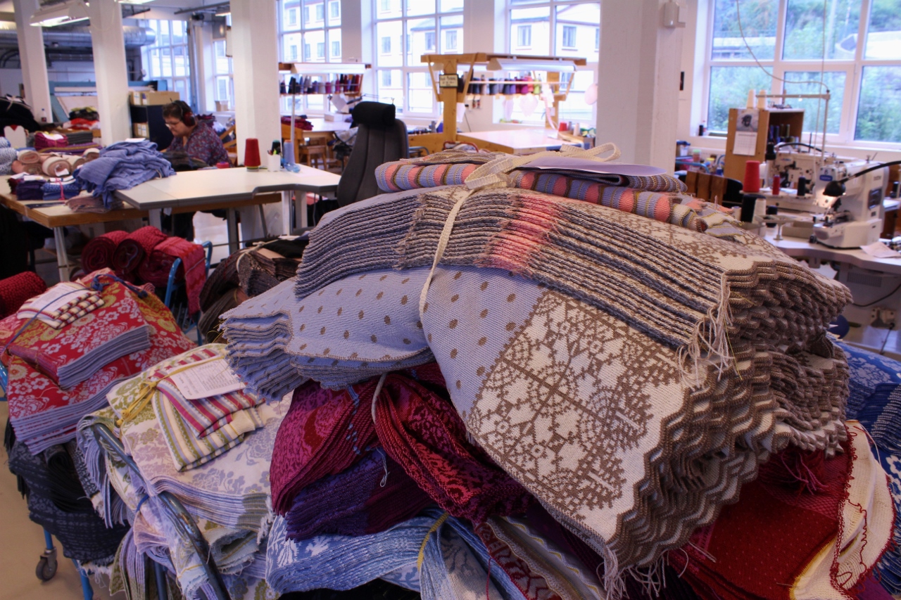 Next morning we moved on towards Bergen. Stig and me stopped to enjoy the knit wear factories along the route. At Oleana they make my favorite cardigans, based on old, norwegian embroidery and weaving patterns.What a treat! I could talk to everyone, feel the yarns, browse the patterns and marvel at the colors.
