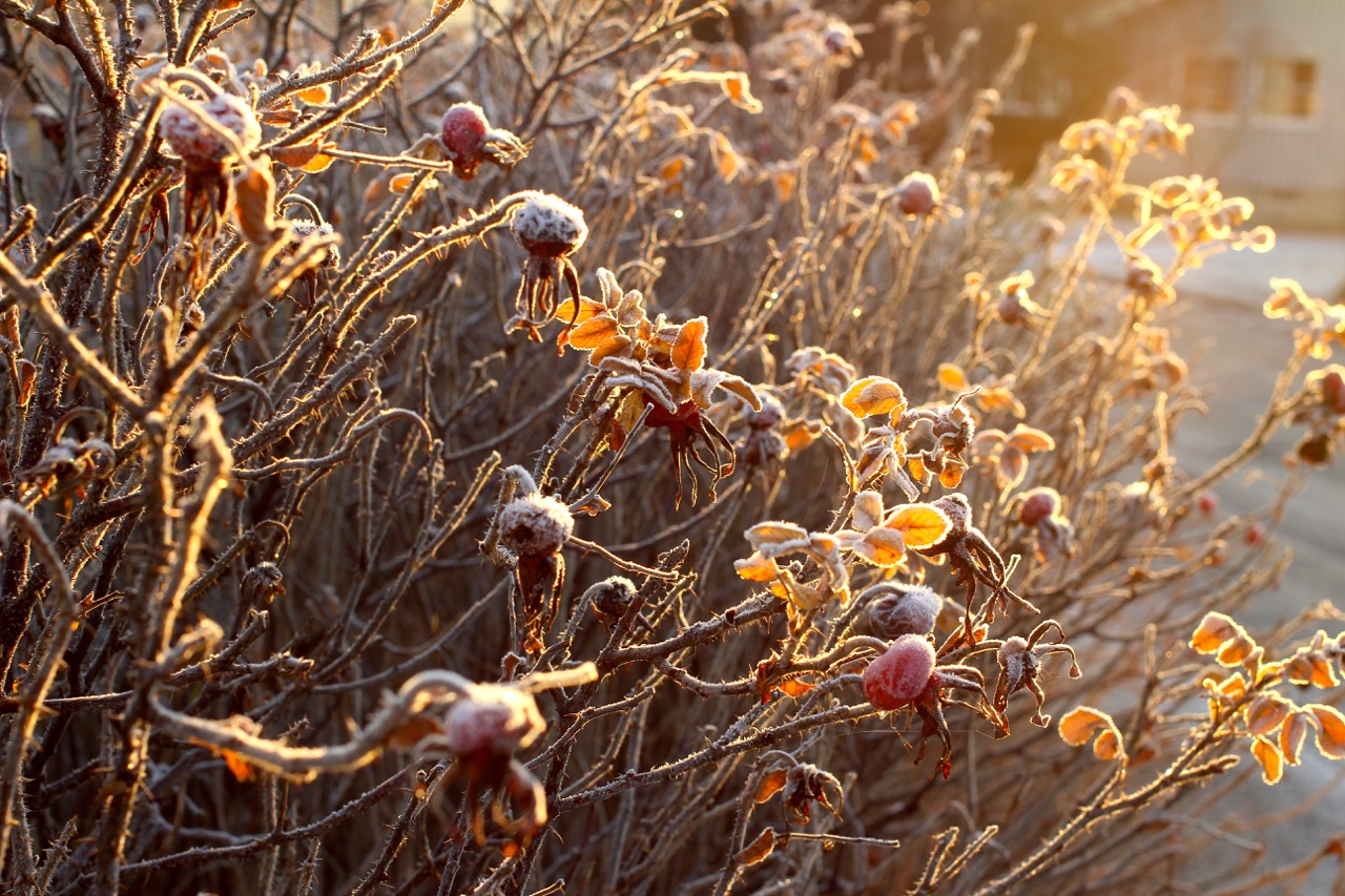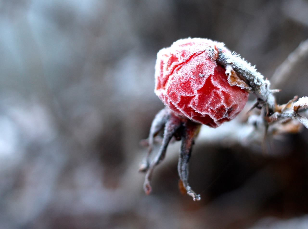 frossen bilComing out I discovered that my car was ready for a part in Dr. Zhivago, being transformed from black to pearly, glittering, frosty magic. How beautiful! I went inside for may camera before removing the ice. Then I saw the rubies in our rose hip hedge, I was so happy, and of course had to grab some shots. As I did I felt my whole being filled with wonder and joy, as I often do when I stop and stay in the moment of something beautiful.