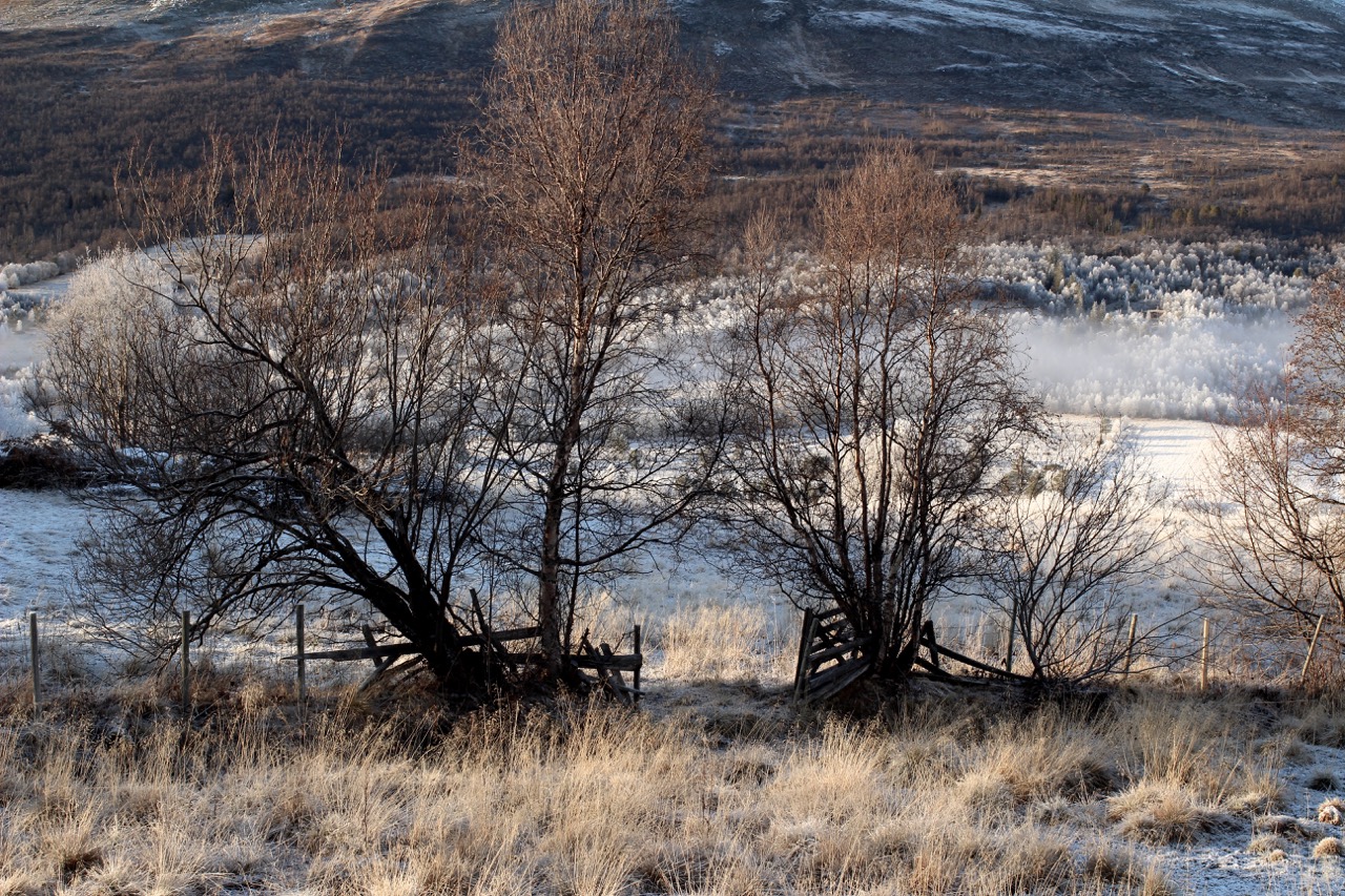 Saturday we woke in magic. I did not even wait to get dressed to start taking pictures, and it only got better. It was cold, damp and sunny. IMG_8108The fog from the lake and the river froze to crystals that covered a broad band down in the valley, then there was an equally broad band of frozen golden fall, from there the mountains were towering dusted by the first snow. Then night fell, early as it does in november. The stars came down almost to be touched, the northern light was dancing from one end of our world to another.
